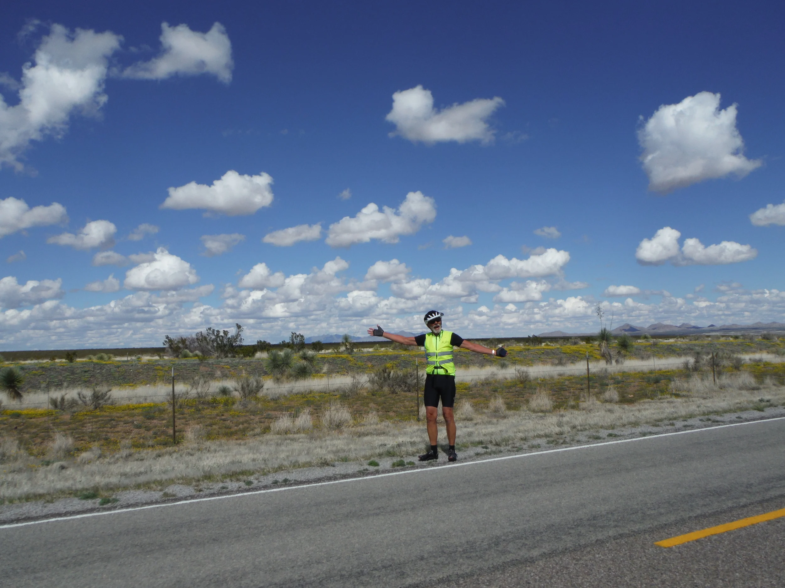 We’re starting to get into the rhythm of SAG duties and alternate riding days. Zipper alarms begin around 5:30. There’s just no sleeping through 53 people each unzipping sleeping bags, screen and rain tent flies and zipping up warm clothing. Coffee at 6:30 and breakfast at 7:00. Riders begin to leave as soon as it’s light. SAG folks leave as assigned to take care of 1st SAG, lunch and 2nd SAG. Setting up the rest stop Involves lugging 2 tables and 15 chairs from the trailer to a safe wide shoulder or park, putting out water, soft drinks, snacks, fruit and sanitizing everything before the first rider arrives. A good spot for a SAG includes a surrounding area with sufficient growth of bushes to send women in one direction and men in another. This is the SAG stop near Valentine Texas.