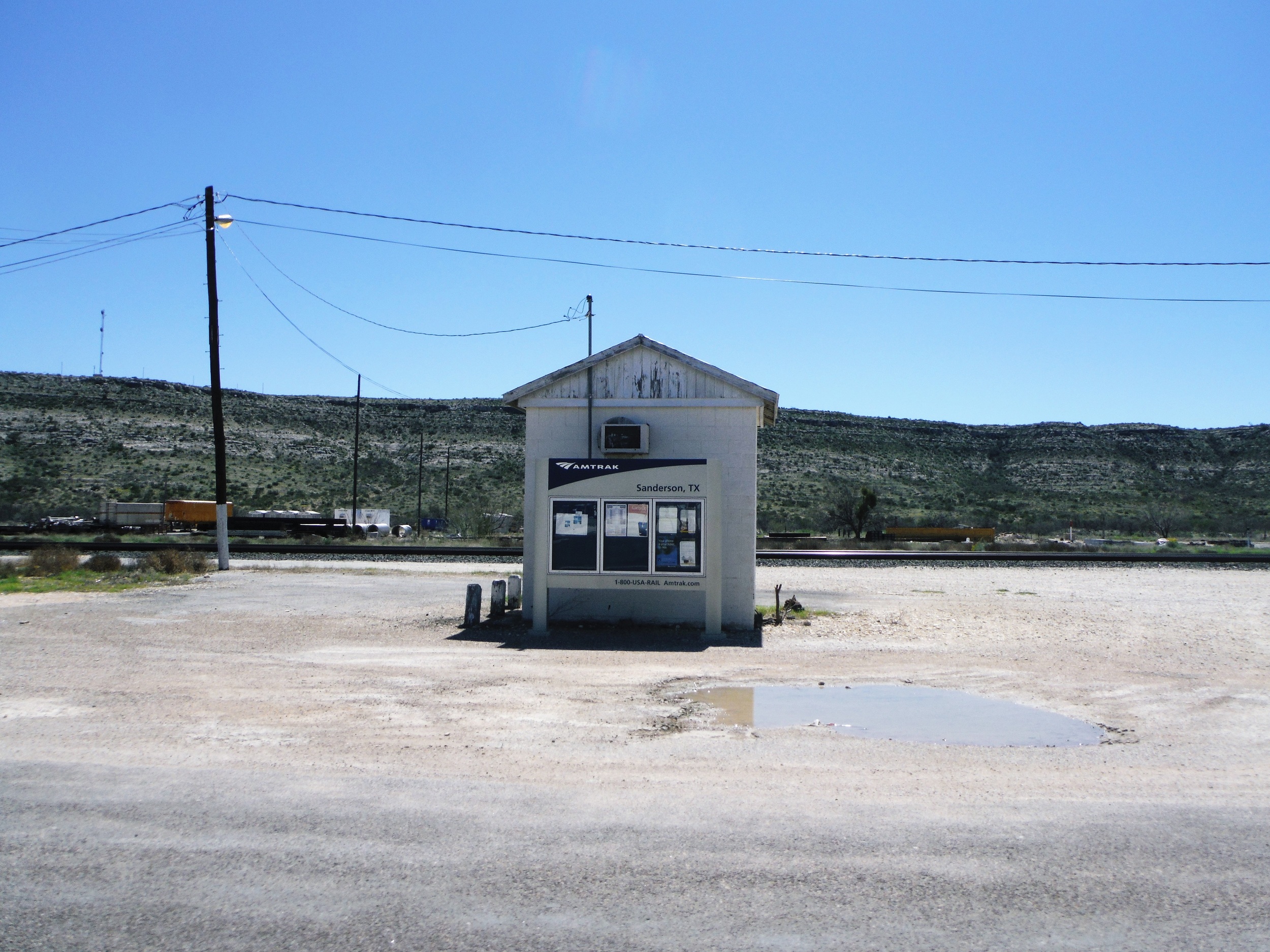 West Texas on US 90 is unbelievably remote. The 6-man football team for Sanderson High sometimes must travel 275 miles to a game, play and drive 275 miles back in a single day. The trade-off for the remoteness, according to the proprietor of the hardware/plumbing supply/antique/used book store in town is the community and low cost of living. One sign offered newer 2 bedroom house on acreage for $59,000. Note the Amtrak station.
