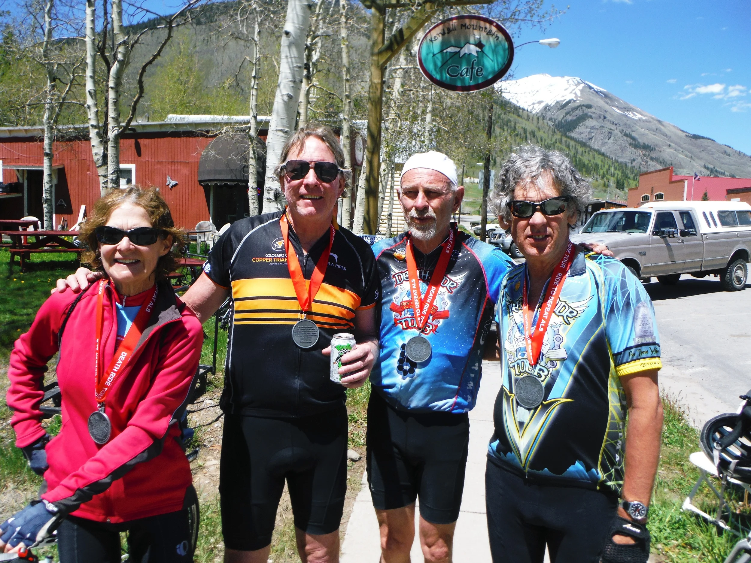The higher elevations still had snow. It is sure much nicer to ride past snow on a clear 55 degree day than ride in it as we did on day one. We celebrated when we arrived at the finish line, had a good dinner back in Ouray then eased our muscles into the outdoor hot top at the motel. Great ride experience.