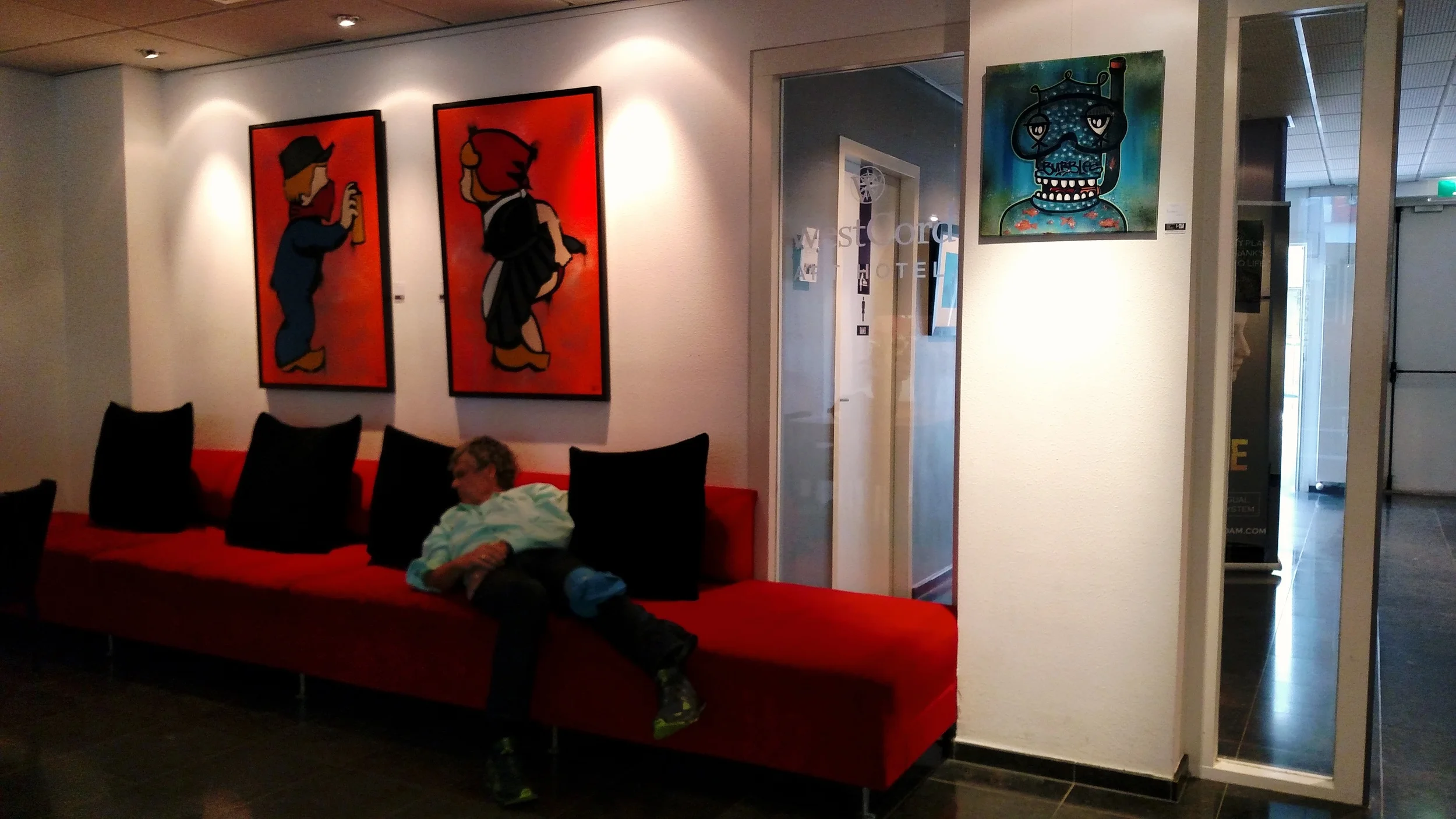 It’s a long, overnight flight to Amsterdam. I should have realized that 45 minutes is not enough time to get from a domestic terminal to the international terminal at Dulles. It did give us a chance to stretch our legs at sprint speed. It was surprising easy to get from the airport to our hotel via train and taxi. The Westcord Art hotel has original modern art work everywhere including the entire wall behind the bed. John slept in the lobby while I explored the street and found the grocery store.